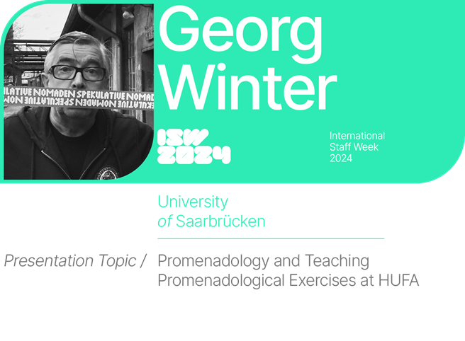 The topic of his talk is Promenadology and Teaching Promenodological Exercises to Students of HUFA. In uncertain times, artists and designers are faced with new situations and questions about their self-image and their role in artistic and creative participation in social processes. On the basis of nomadic and promenadological practices, we develop methods, tools, skills, forms of action that broaden the horizon, open up the scope and tie in directly with what concerns the participants and how they can transfer it. Places, languages, images, forms of action and objects are changed, seen anew, transformed, taken along, shared and negotiated. Everyone is invited to participate on an interdisciplinary basis. Artistic research, Strollology or promenadological exercise are practical, courageous but not always an easy way. In the spirit of Carl Einstein: "Miracles are a question of training".