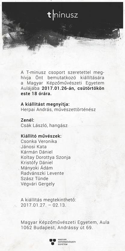 A T mínusz (T-) kifejezés a visszaszámlálás egyfajta módjára utal, amely egy adott esemény felé tart, ahol a T az esemény bekövetkeztének időpontja, a mínusz az azt megelőző időt jelöli. Néhány fiatal képzőművész úgy érezte, hogy művészi útjuk elején szükségük lenne társakra, más nézőpontokra, hogy az önmagáért való alkotásból teremtő erő válhasson.