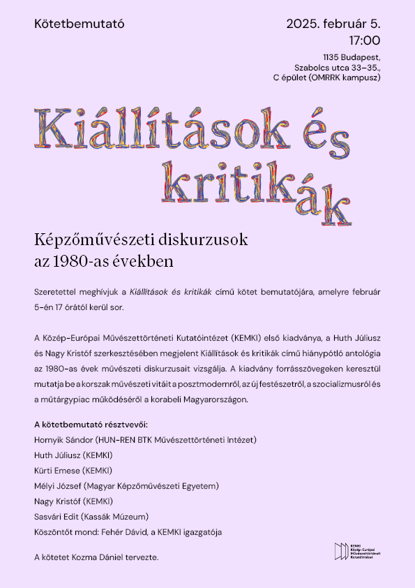 A Közép-Európai Művészettörténeti Kutatóintézet (KEMKI) első kiadványa, a Huth Júliusz és Nagy Kristóf szerkesztésében megjelent Kiállítások és kritikák című hiánypótló antológia az 1980-as évek művészeti diskurzusait vizsgálja. A kiadvány forrásszövegeken keresztül mutatja be a korszak művészeti vitáit a posztmodernről,az új festészetről,a szocializmusról és a műtárgypiac működéséről a korabeli Magyarországon.